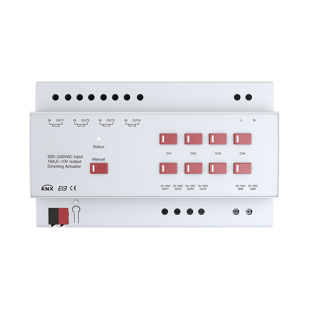 Das Ausführungsmodul verfügt über 4,6 Kanäle, jeder Kanal enthält einen Relaisschalter Ausgang und einen 0-10V Ausgang. 0-10V Dimmsignalschnittstelle und 0-10V Dimmtransformator können Glühlampen, Leuchtstofflampen, LED und andere Lampen dimmen. Mit manuellen Bedientasten zeigt LED den Dimmstatus jeder Schaltung an.